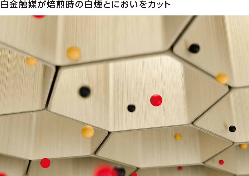 モトヤマの消煙消臭装置は、触媒酸化法により焙煎時に発生する白煙(油煙)やにおいをカットすることができます。