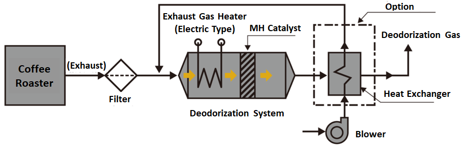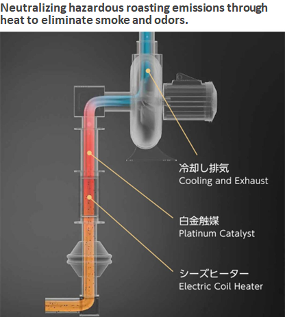 MOTOYAMA’s smoke and deodorization removal system effectively removes white smoke and odors generated during roasting by using catalytic oxidation.