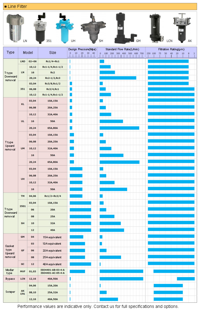 Various series of line-mounted filters are available according to operating pressure, fluid type, port size, filtration level, and mounting method.