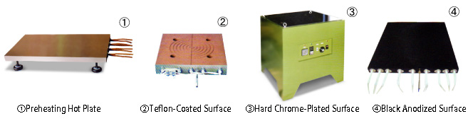 - Hot plates are available in cartridge heater insertion type and sheath heater casting type.