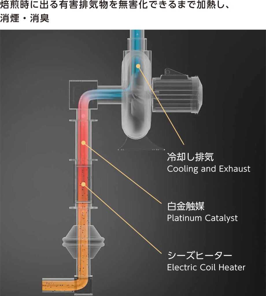 装置概要 コーヒーの焙煎工程で生豆を加熱するときは、メイラード反応や様々な化学的変化に起因して白煙(油煙)やに